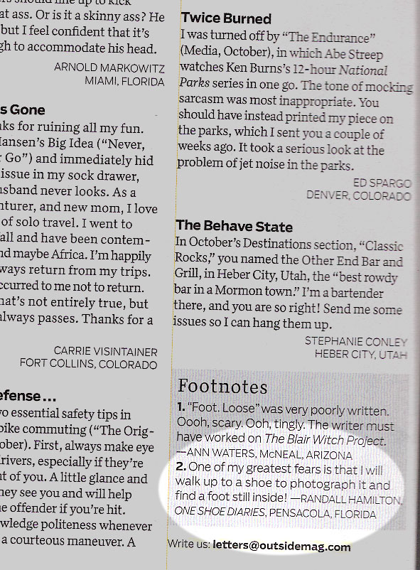 Of course it struck a cord with me so I wrote a letter to the editor. To my surprise a neighbor informed me about seeing my name in a magazine recently, and remembered it was Outside Magazine. I immediately went home and searched through my issue and sure enough, there it was. Just a small excerpt, but pretty cool to me nonetheless. Below is the letter I wrote in its entirety.