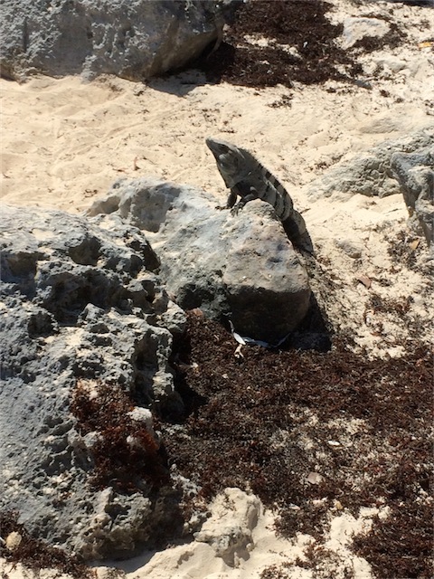 The ruins themselves were really cool, and very picturesque against the vibrant turquoise waters of the seas that met up with an electric blue sky dotted with small, bright white, puffy clouds. The crumbling limestone ruins are covered with iguanas of all sizes. Nora loved seeing them, but if you approached a little too close they would start bobbing their heads as a warning so we kept our distance.